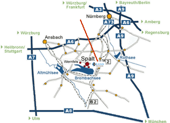über die B 2:   Nürnberg - Augsburg, in Röttenbach Abfahrt nach Spalt (10 km)